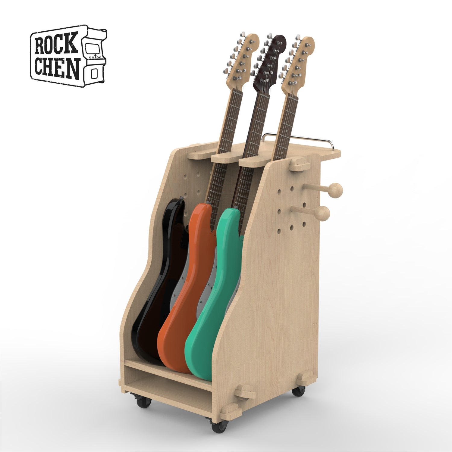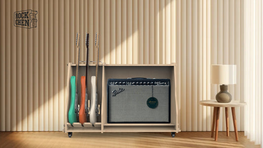 Guitar stand, wooden guitar storage stand, multiple sets and rows of upright instruments, floor standing with pulleys, movable guitar stand.
